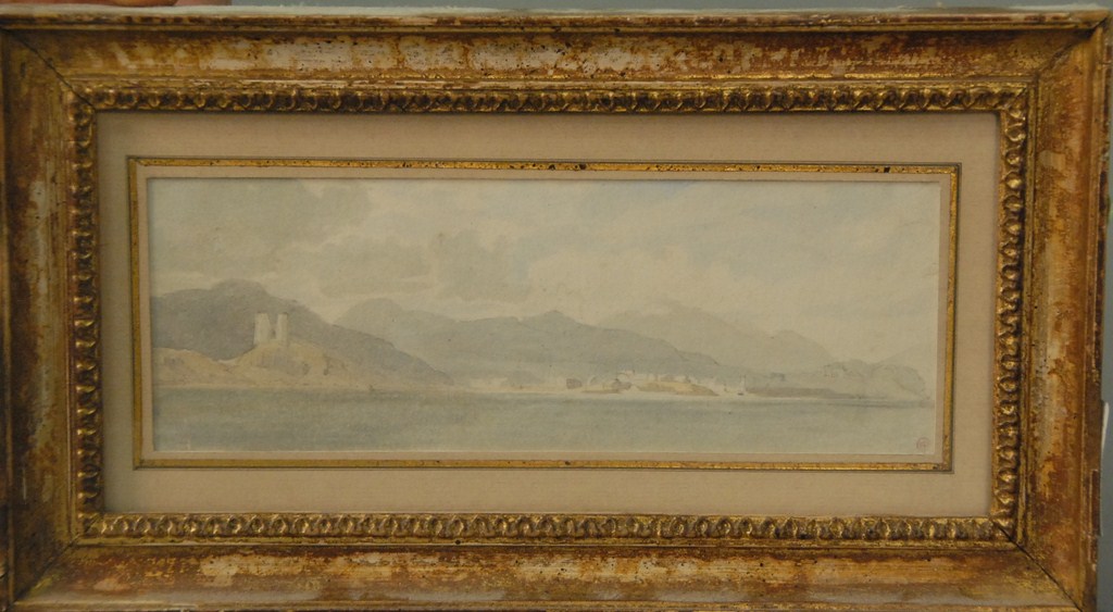 Edward Duncan 1803-1882 MOUNTAINOUS COSTAL SCENE watercolor initialed lower right gallery label on reverse 3 3/8 x 8 7/8 Provenance: From prominent Woodbridge, Connecticut family collection.