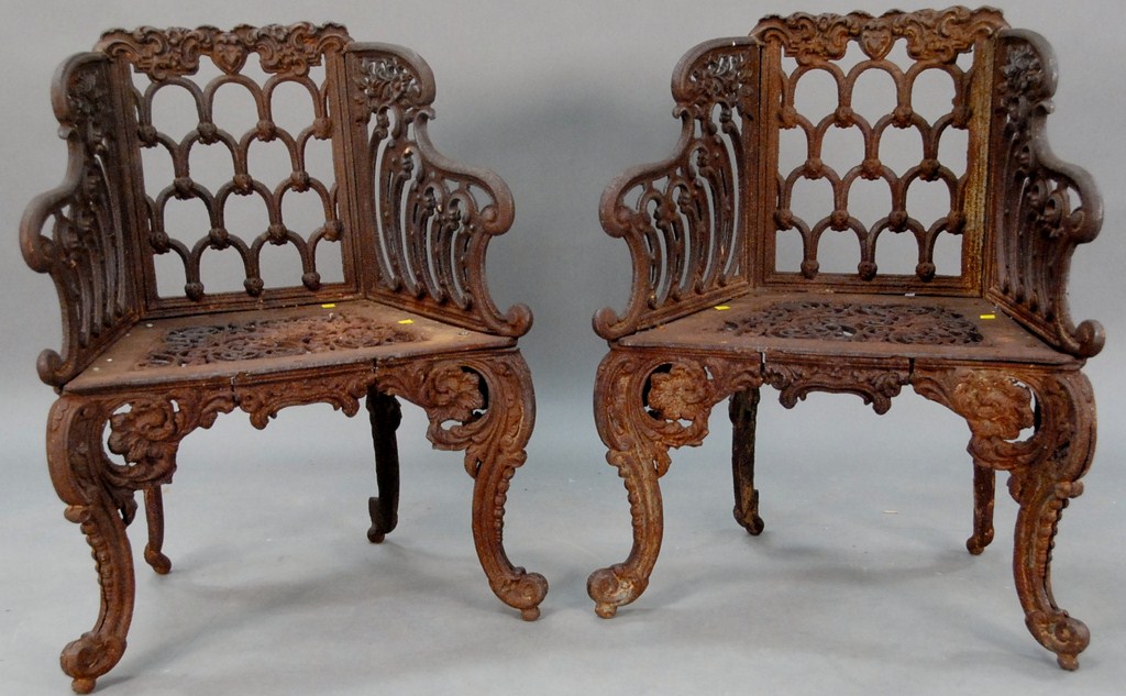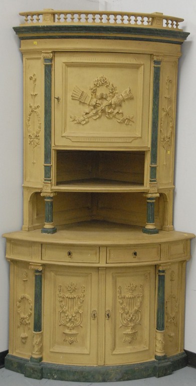 Pair of Continental corner cabinets in two parts, upper section with gallery top over single bowed door on base with two drawers and two doors, overall mustard yellow with faux green marble posts and columns, 19th century. Provenance: property from a home in Rockville Center, New York which was decorated by Iris Apfel. ht. 85in. wd. 35in. dp. 32in.