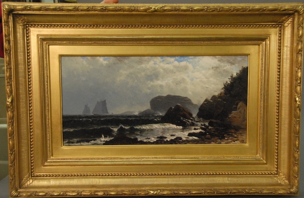 Alfred Thompson Bricher 1837-1908 PASSING WEATHER, MAINE oil on canvas signed lower left A. T.Bricher Abby M. Taylor Fine Art lable on back, old paper label on frame, restretched and relined. 9 1/4 x 19 1/4