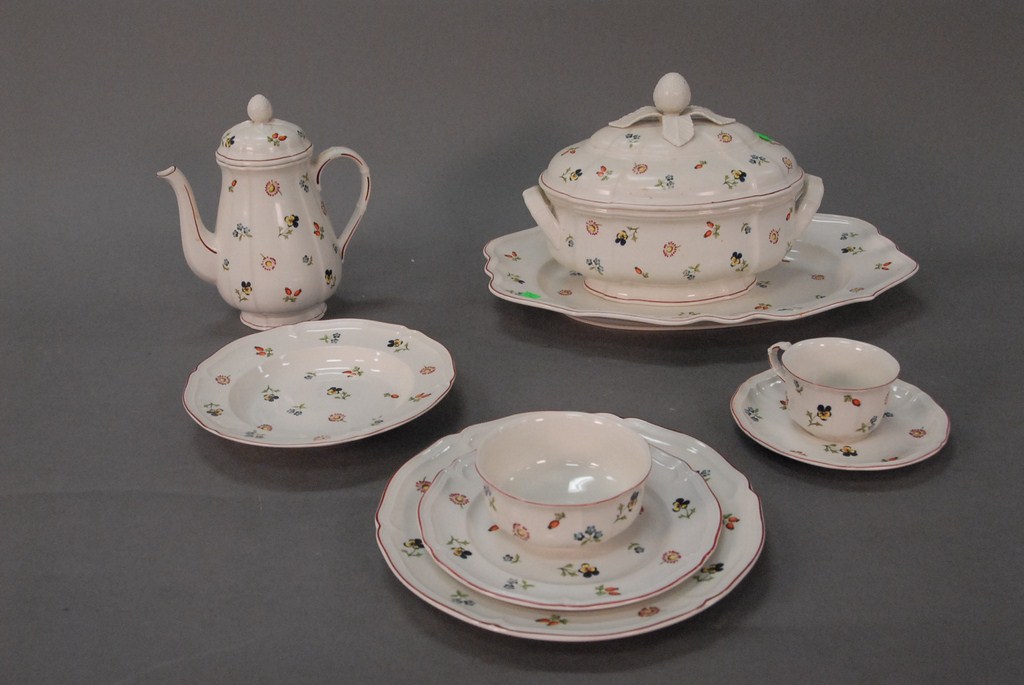 Villeroy & Bach Petite Fleur pattern dinnerware setting for twelve plus service piece, 120 total pieces some slight damage. Provenance: From prominent Woodbridge, Connecticut family collection.