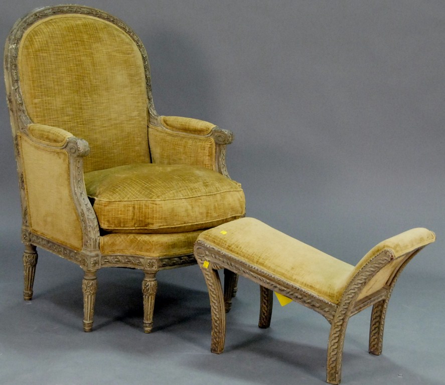 Louis XVI style bergere with carved grey painted frame and arm supports on unusual shaped six leg base, custom upholstery with companion footstool. Provenance: property from a home in Rockville Center, New York which was decorated by Iris Apfel.