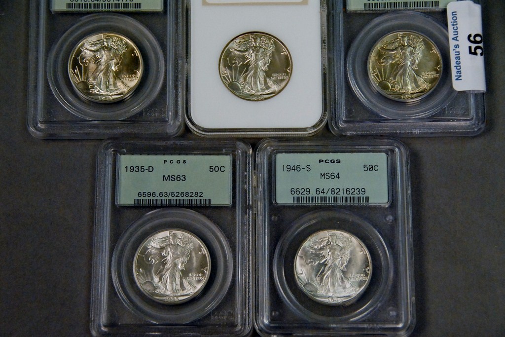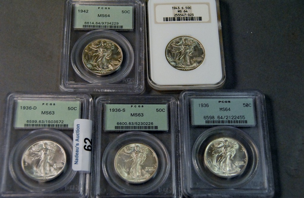 Five half dollars 1936-D PCGS 63, 1936-S PCGS 63, 1936 PCGS 64, 1942 PCGS 64, and 1943-S NGC 64.