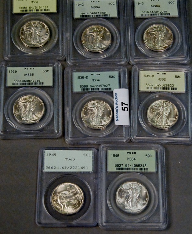 Eight half dollars 1936-D PCGS 64, 1939 PCGS 65, 1939-D PCGS 62, 1939-S PCGS 64, 1942 PCGS 64, 1943 PCGS 64, 1945 PCGS 63, and 1946 PCGS 64.