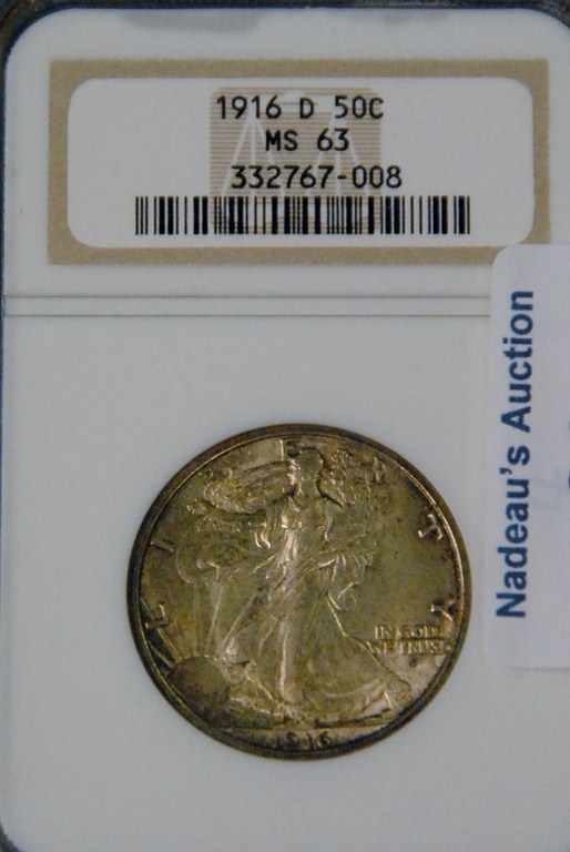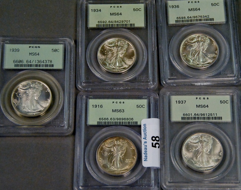 Five half dollars 1916 PCGS 63, 1934 PCGS 64, 1936 PCGS 64, 1937 PCGS 64, and 1939 PCGS 64.
