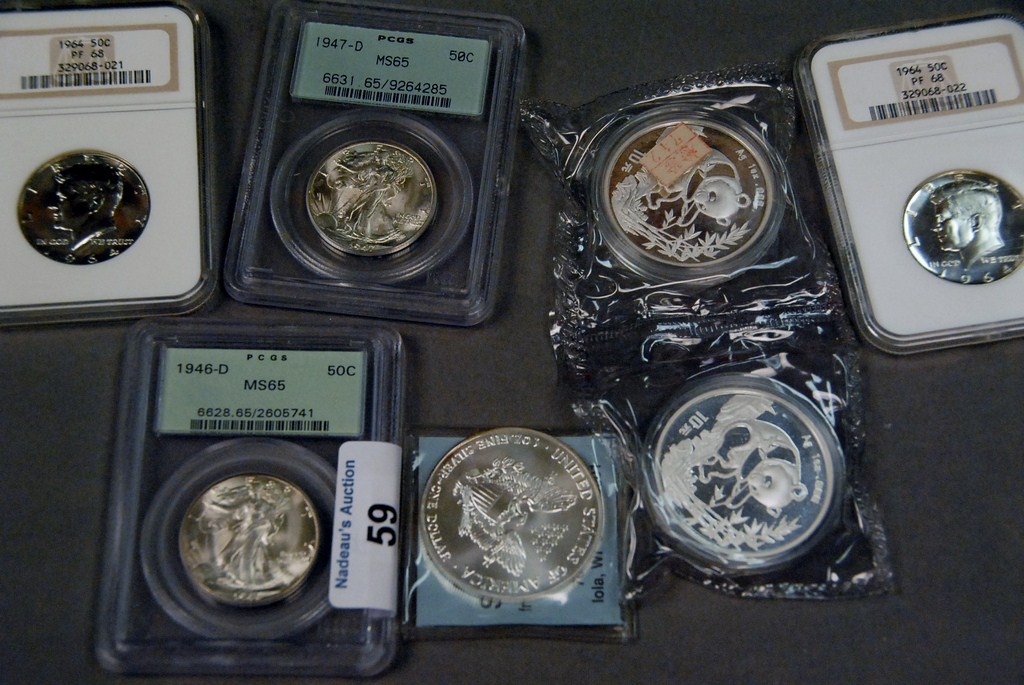 Four half dollars plus three silver bullion coins 1946-D PCGS 65, 1947-D PCGS 65, 1964 proof 68, 1964 proof 68, two one ounce Panda Silver rounds 1994, and one 1993 U.S. silver Eagle.
