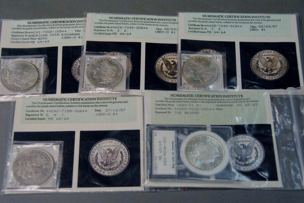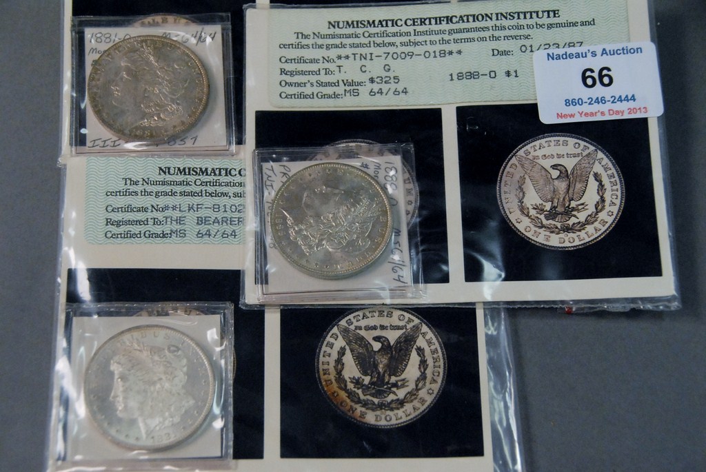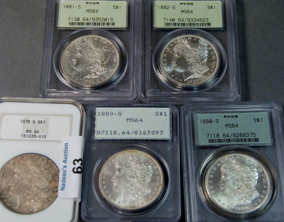 Five silver dollars1878-S NGC 64, 1880-S PCGS 64, 1880-S PCGS 64, 1880-S PCGS 64, and 1882-S PCGS 64.