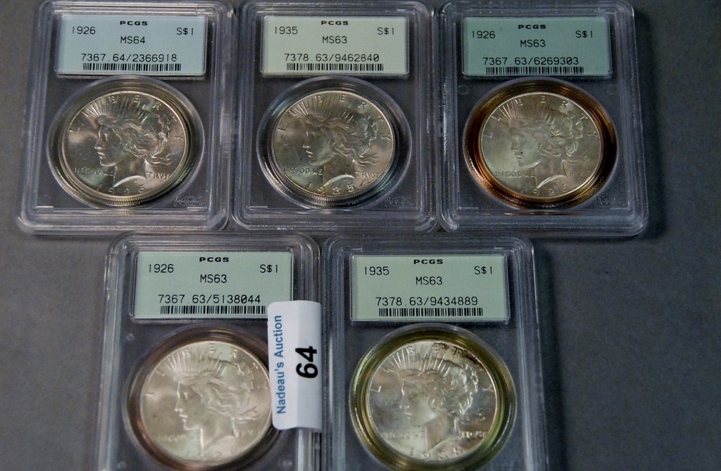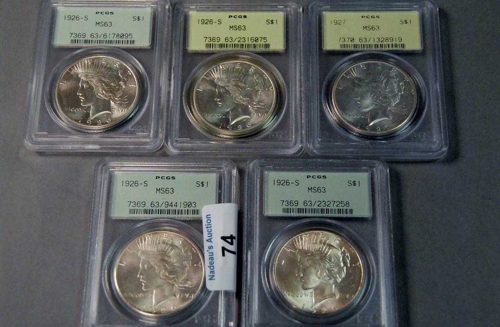 Five silver dollars 1926-S PCGS 63, 1926-S PCGS 63, 1926-S PCGS 63, and 1927 PCGS 63.