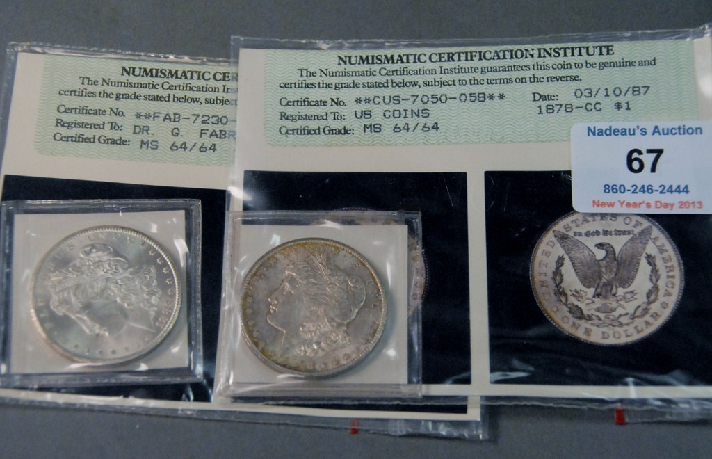 Two silver dollars 1878-CC NCI 64/64 and 1883-CC NCI 64/64.