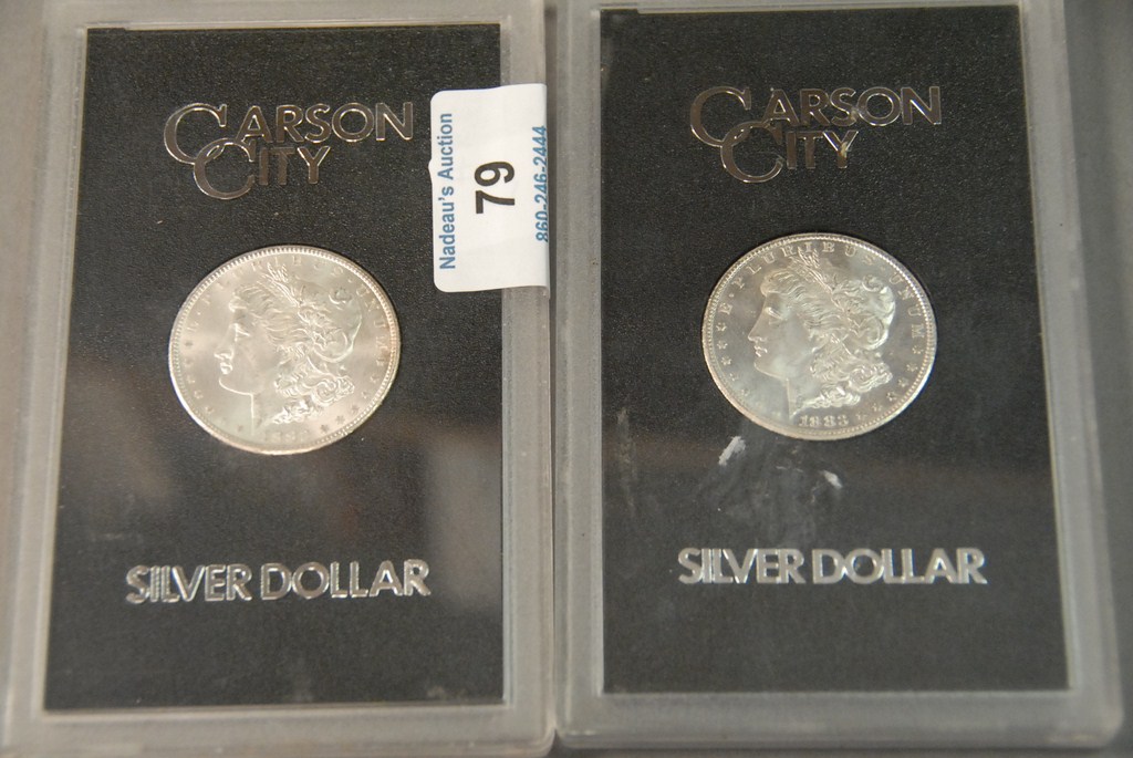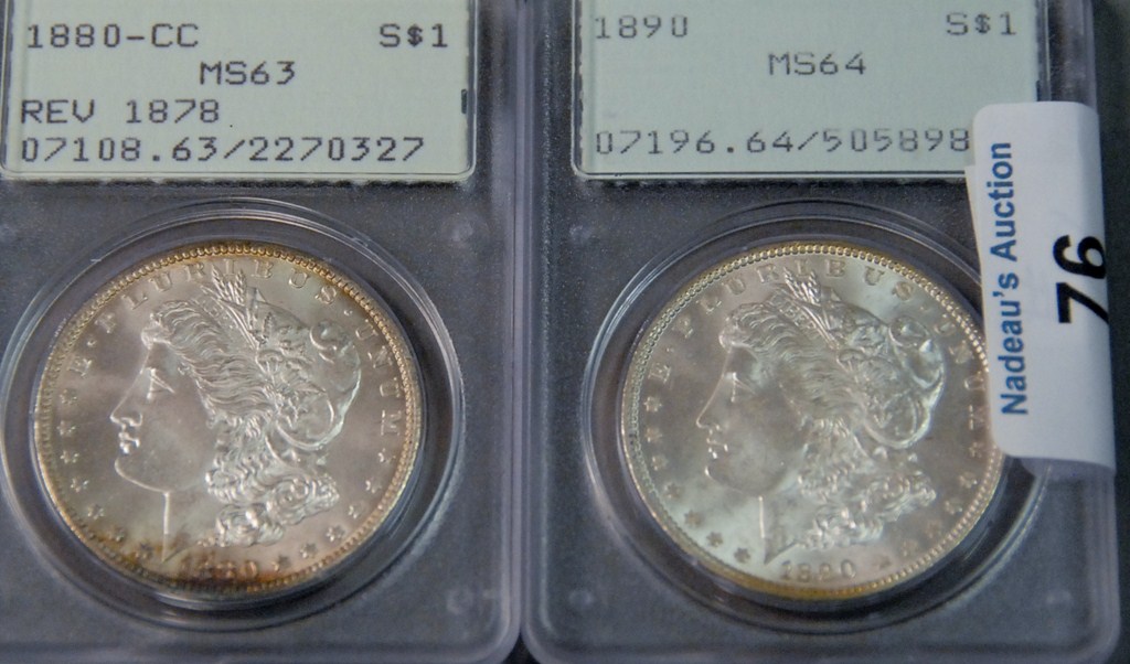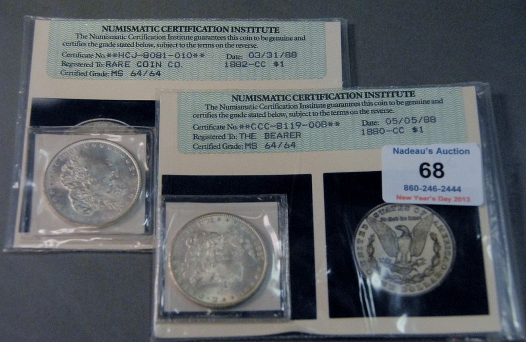 Two silver dollars 1880-CC NCI 64/64 and 1882-CC NCI 64/64.