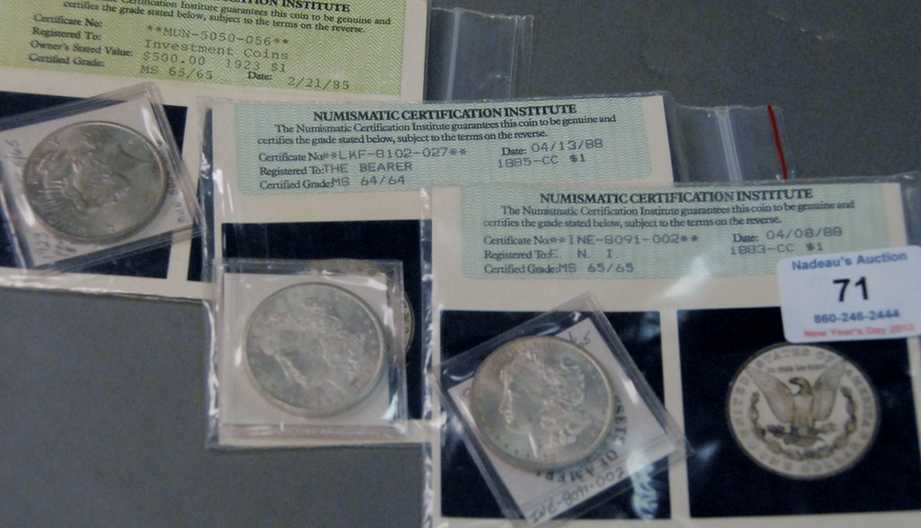 Three silver dollars 1883-CC NCI 65/65, 1885-CC NCI 64/64, and 1923 NCI 65/65.