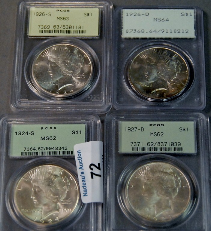 Four silver dollars 1924-S PCGS 62, 1926-D PCGS 64, 1926-S PCGS 63, and 1927-D PCGS 62.