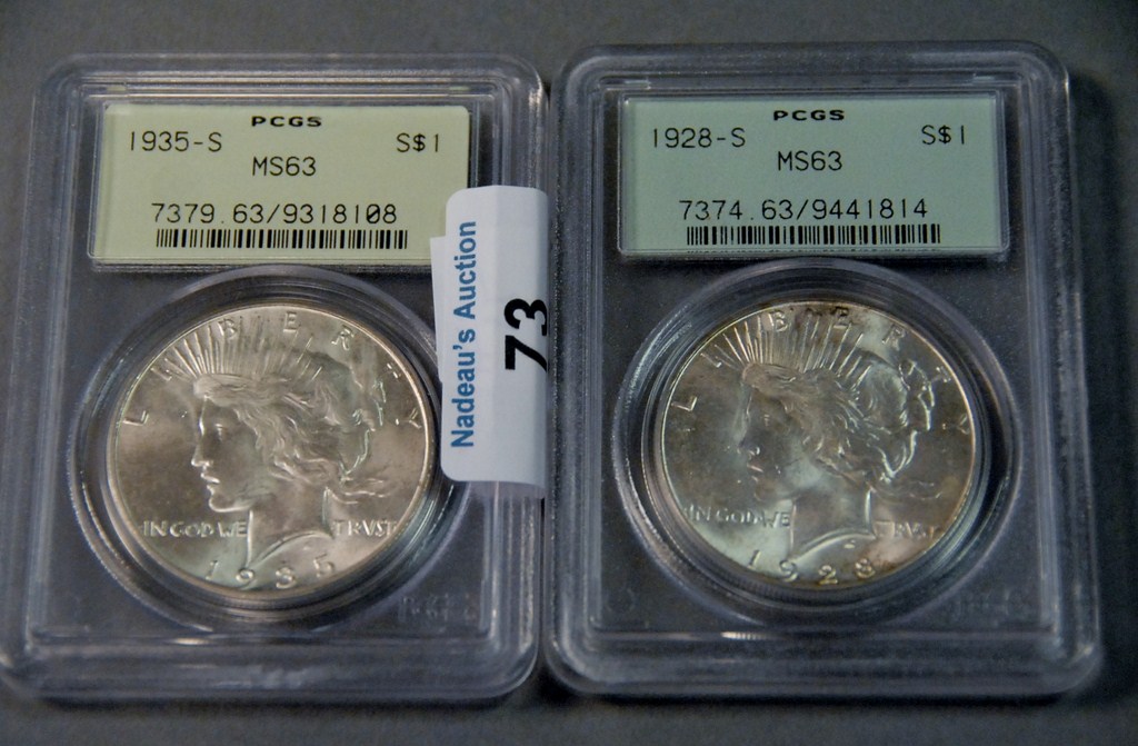 Two silver dollars 1928-S PCGS 63 and 1935-S PCGS 63.