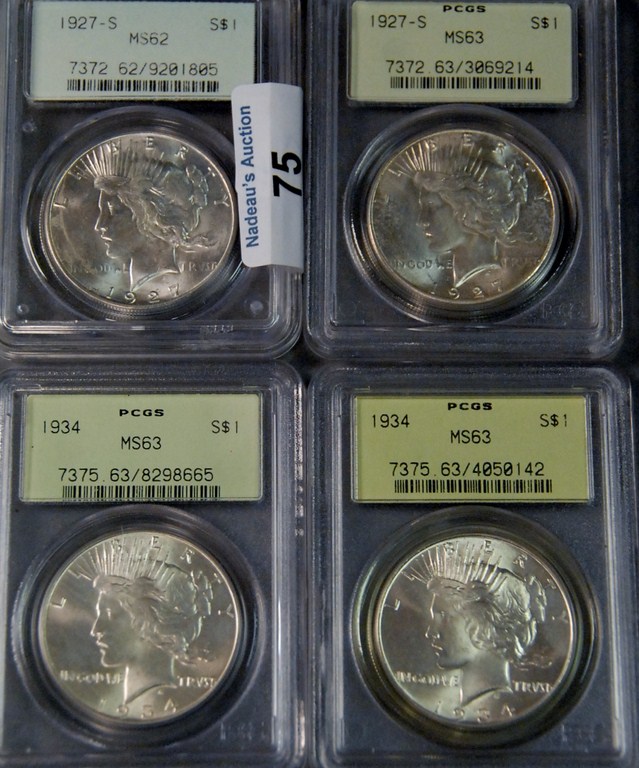 Four silver dollars 1927-S PCGS 62, 1927-S PCGS 63, 1934 PCGS 63, and 1934 PCGS 63.