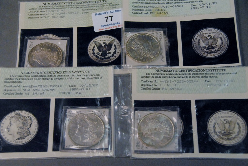 Four silver dollars 1878-S NCI 64/64, 1881-O NCI 64/64, 1880-O NCI 64/64, and 1890-O NCI 64/63.