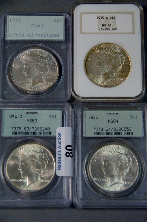 Four silver dollars 1934-D PCGS 63, 1935 PCGS 64, 1935 PCGS 63, and 1935 NGS 61.