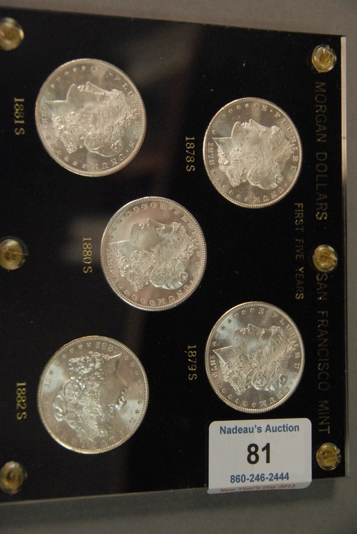 Five silver dollars in Capital Holder 1878-S BU, 1979-S BU, 1880-S BU, 1881-S BU, and 1882-S BU.