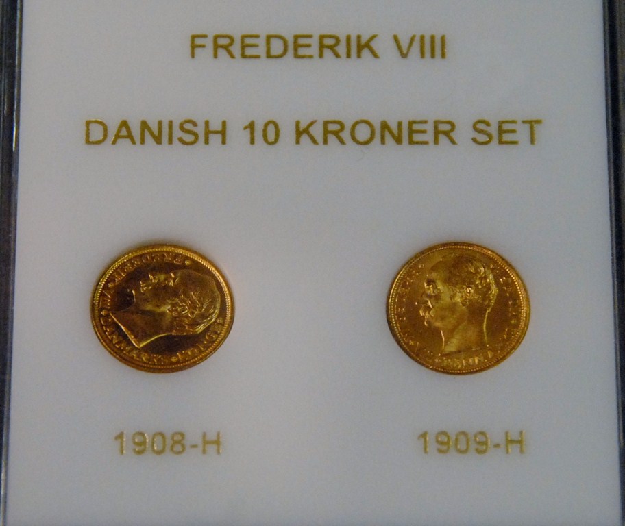 One two-piece set of Danish 10 Kroner Gold 1908-H and 1909-H.