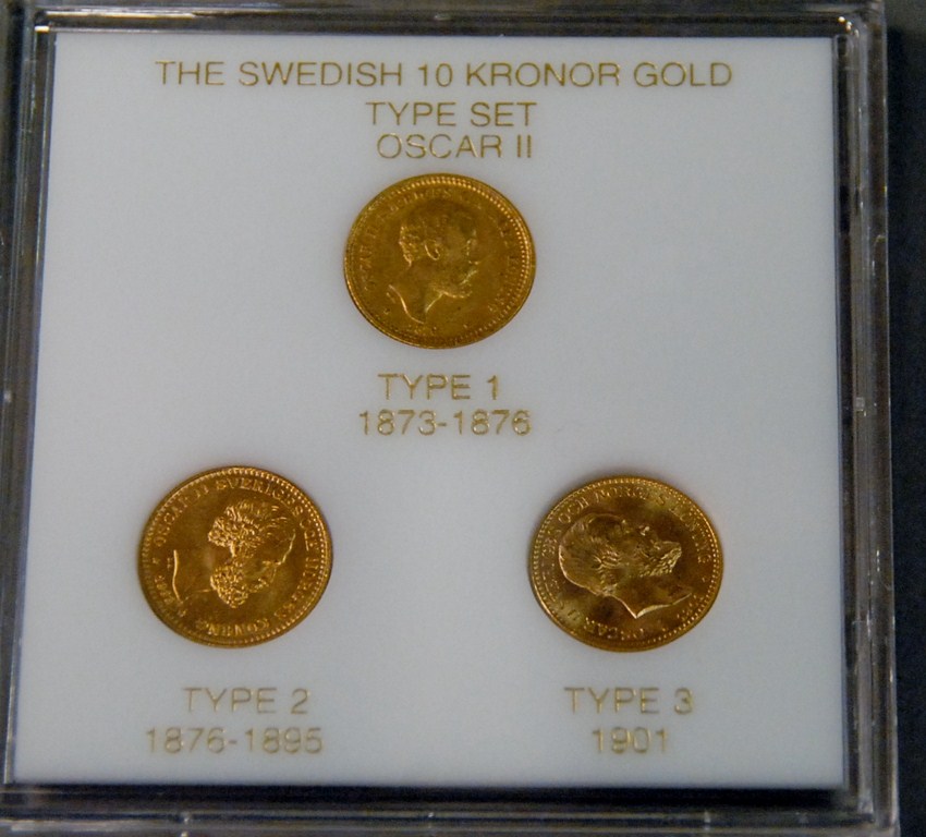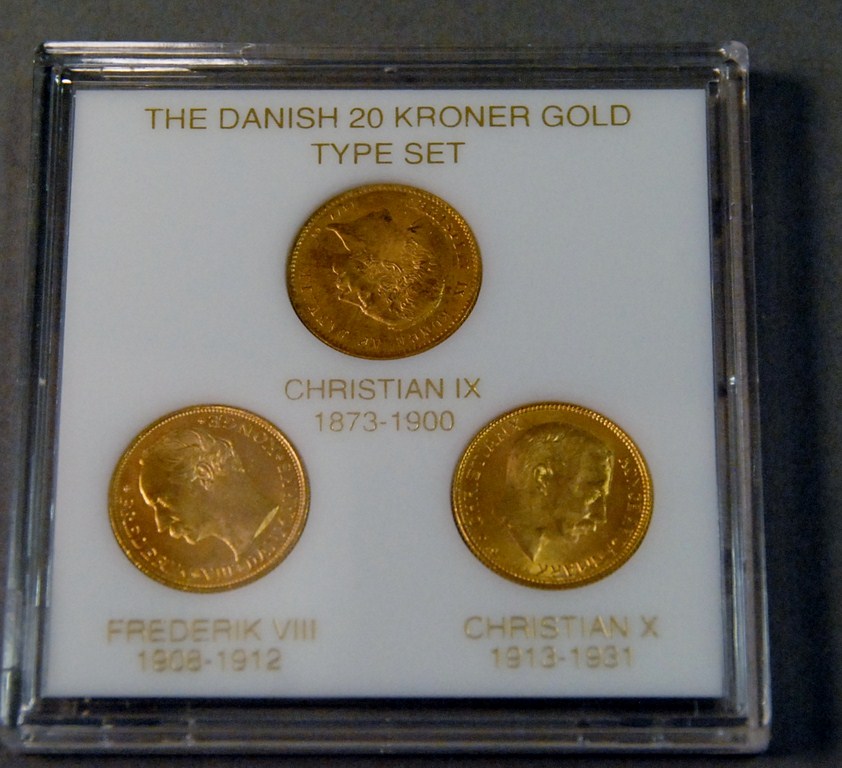 One three-piece set of Danish 20 Kroner Gold 1877, 1908, and 1914.