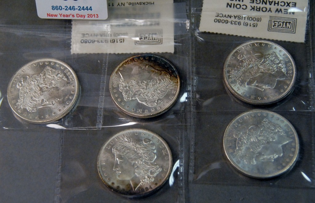 Five silver dollars 1883-O BU, 1883 BU, 1884-O BU, 1886 BU, and 1904-O BU.