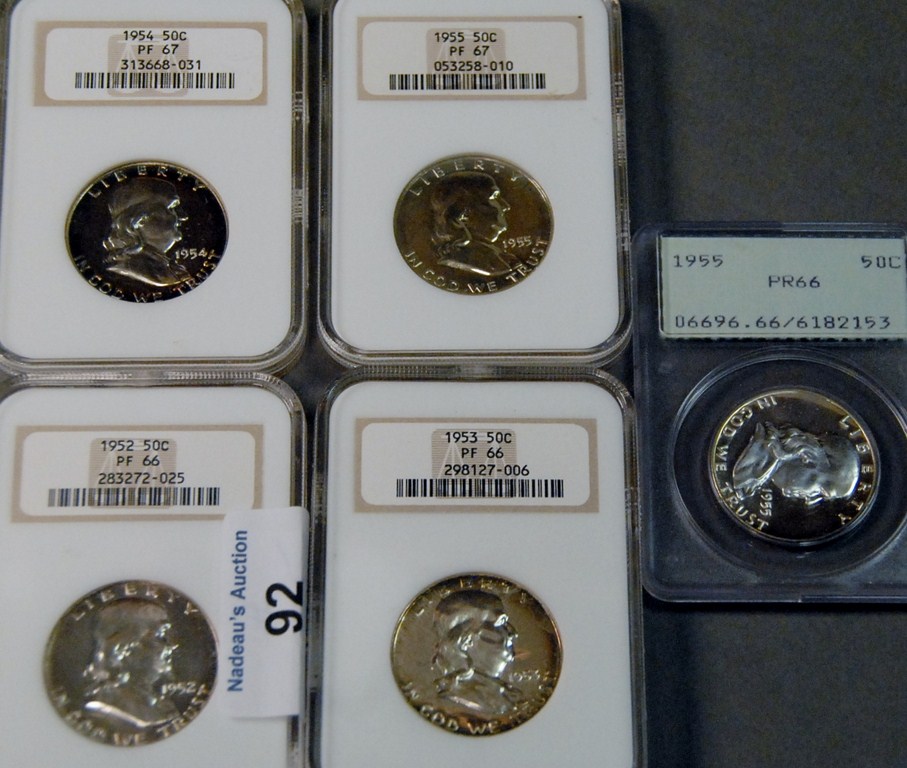 Five proof half dollars 1952 NGC PF 66, 1953 NGC PF 66, 1954 NGC PF 67, 1955 NGC PF 67, and 1955 PCGS Proof 66.