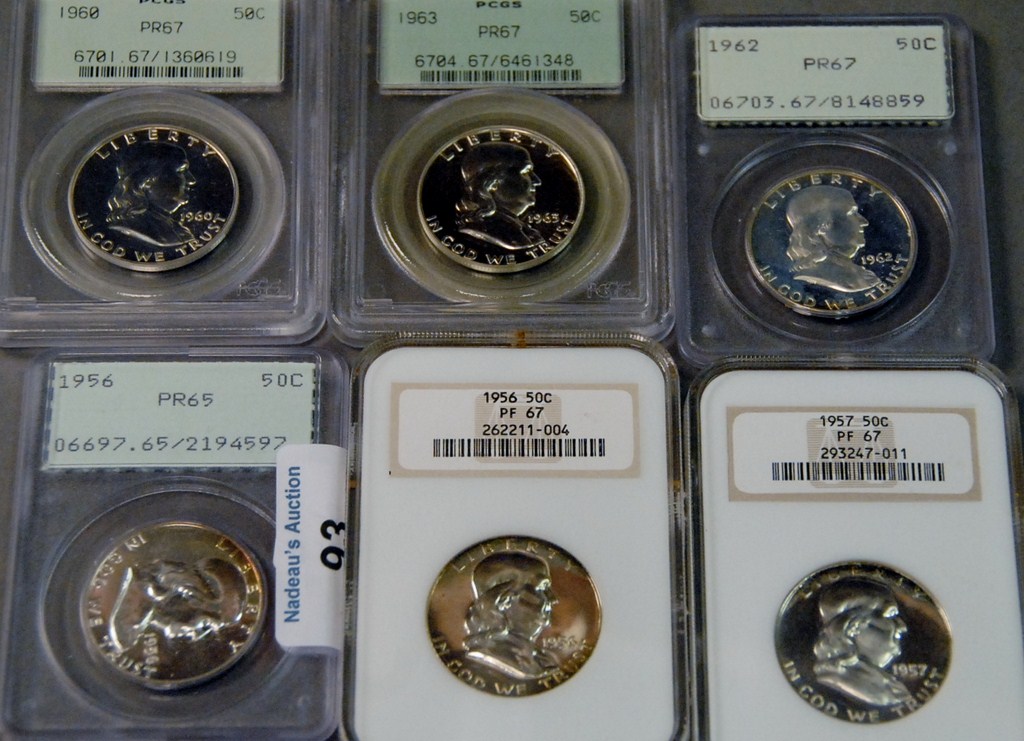 Six proof half dollars 1956 PCGS proof 65, 1956 NGC PF 67, 1957 NGC PF 67, 1960 PCGS PF 67, 1962 PCGS PF 67, and 1963 PCGS PF 67.