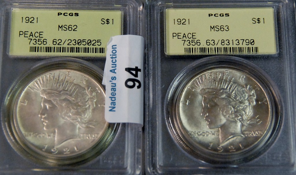Two silver dollars 1921 peace dollar PCGS 62 and 1921 peace dollar PCGS 63.