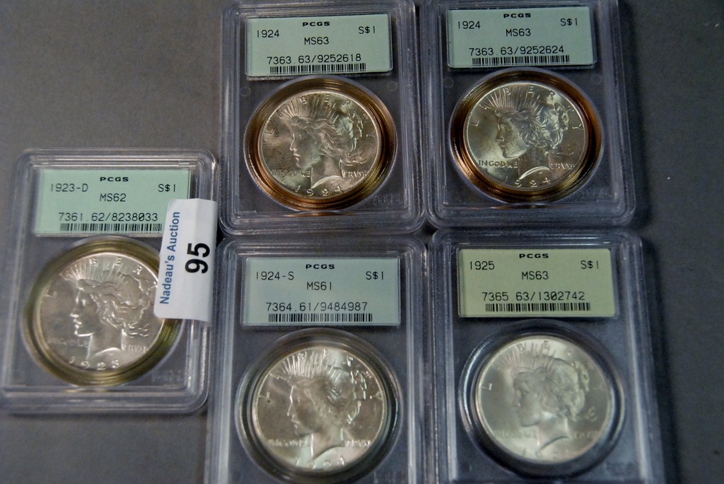 Five silver dollars 1923-D PCGS 62, 1924 PCGS 63, 1924 PCGS 63, 1924-S PCGS 61, and 1925 PCGS 63.
