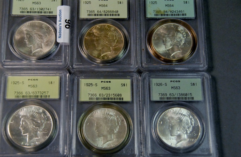 Six silver dollars 1925 PCGS 63, 1925 PCGS 64, 1925 PCGS 64, 1925-S PCGS 63, 1925-S PCGS 63, and 1926-S PCGS 63.