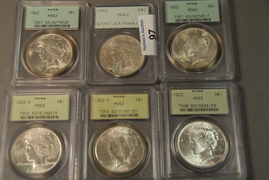 Six silver dollars 1922 PCGS 63, 1922 PCGS 63, 1922 PCGS 63, 1922-D PCGS 63, 1922-S PCGS 62, and 1923 PCGS 63.