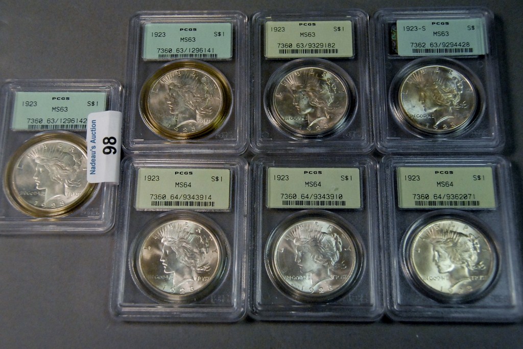 Seven silver dollars 1923 PCGS 63, 1923 PCGS 63, 1923 PCGS 63, 1923-S PCGS 63, 1923 PCGS 64, 1923 PCGS 64, and 1923 PCGS 64.