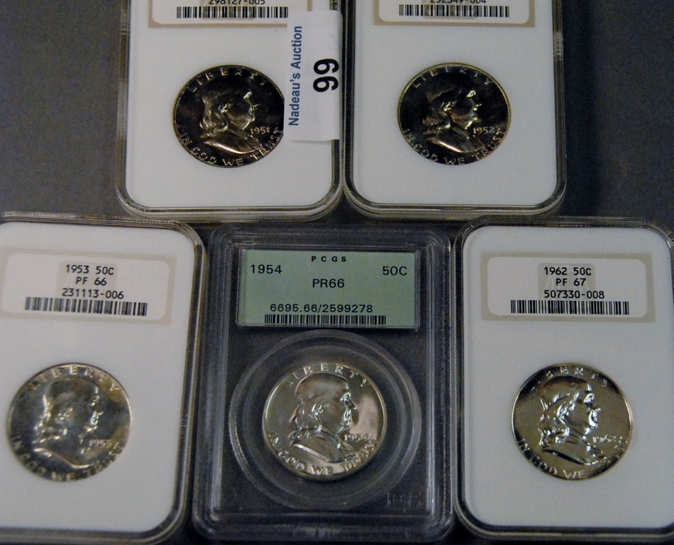 Five proof half dollars 1951 NGC 65, 1952 NGC 66, 1953 NGC 66, 1954 PCGS 66, and 1962 NGC 67.