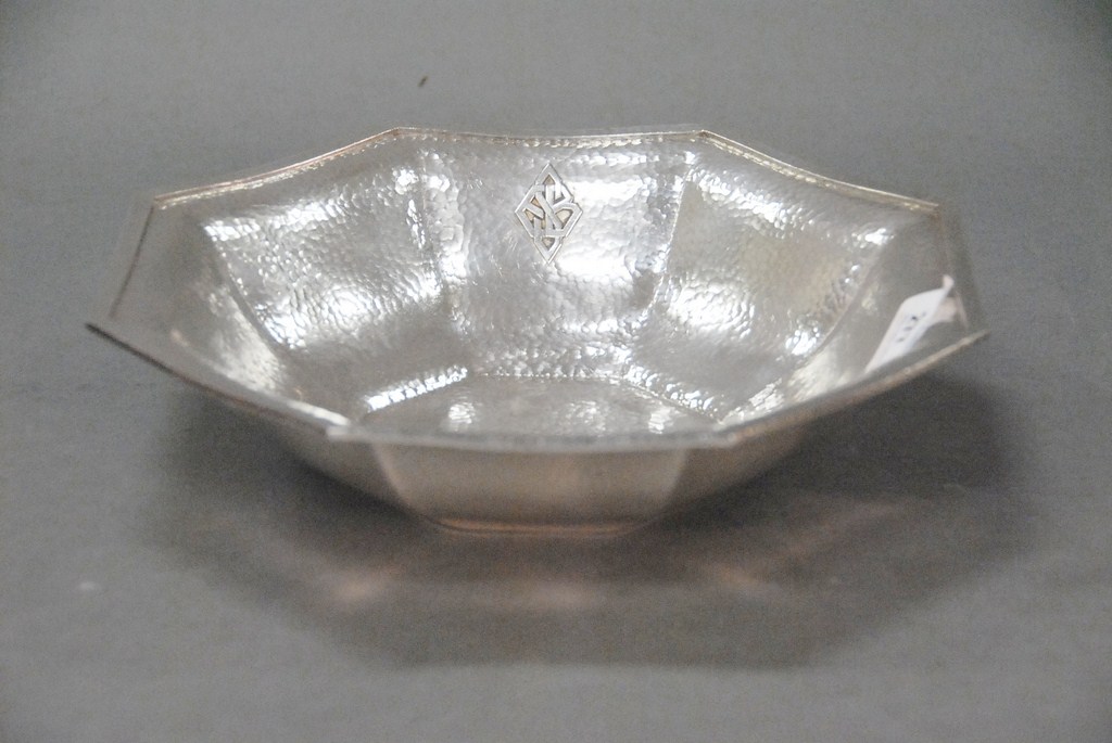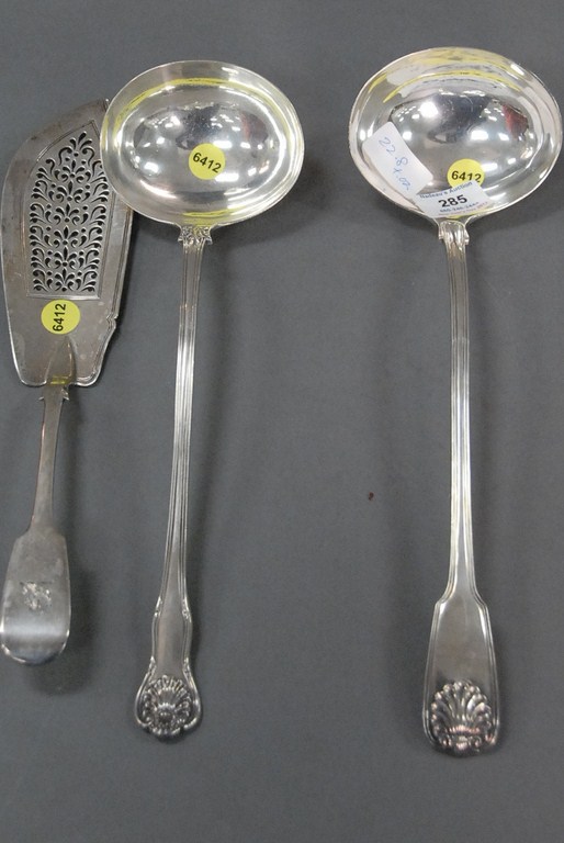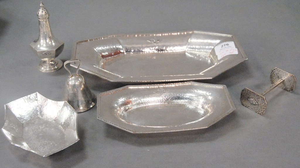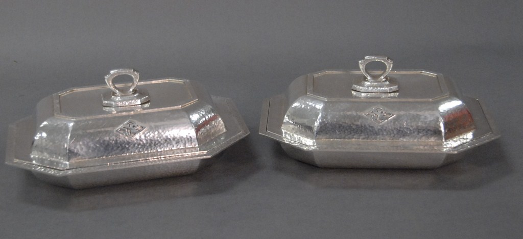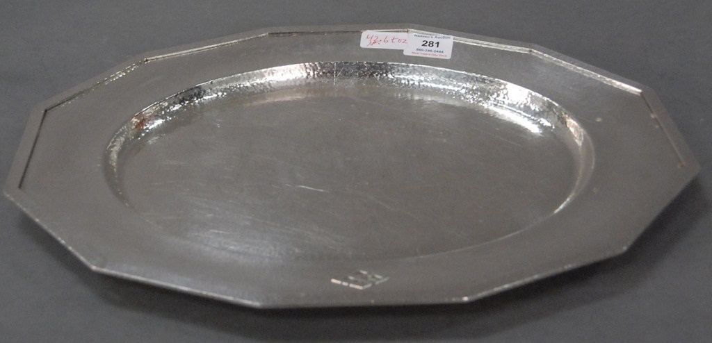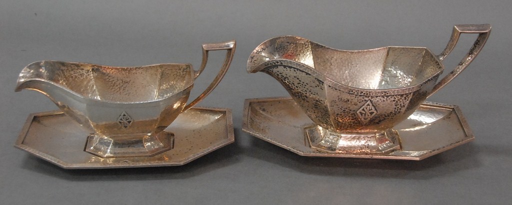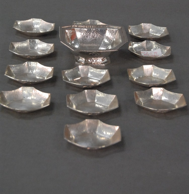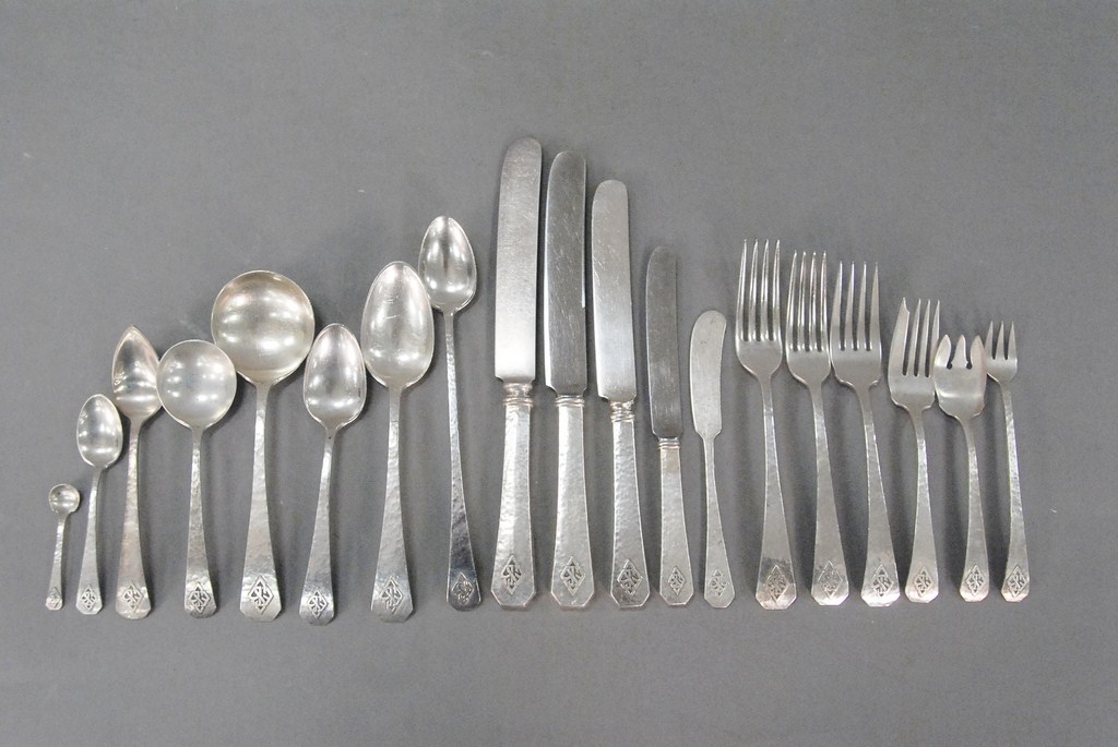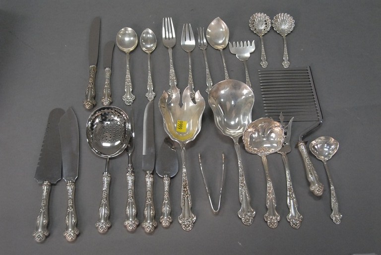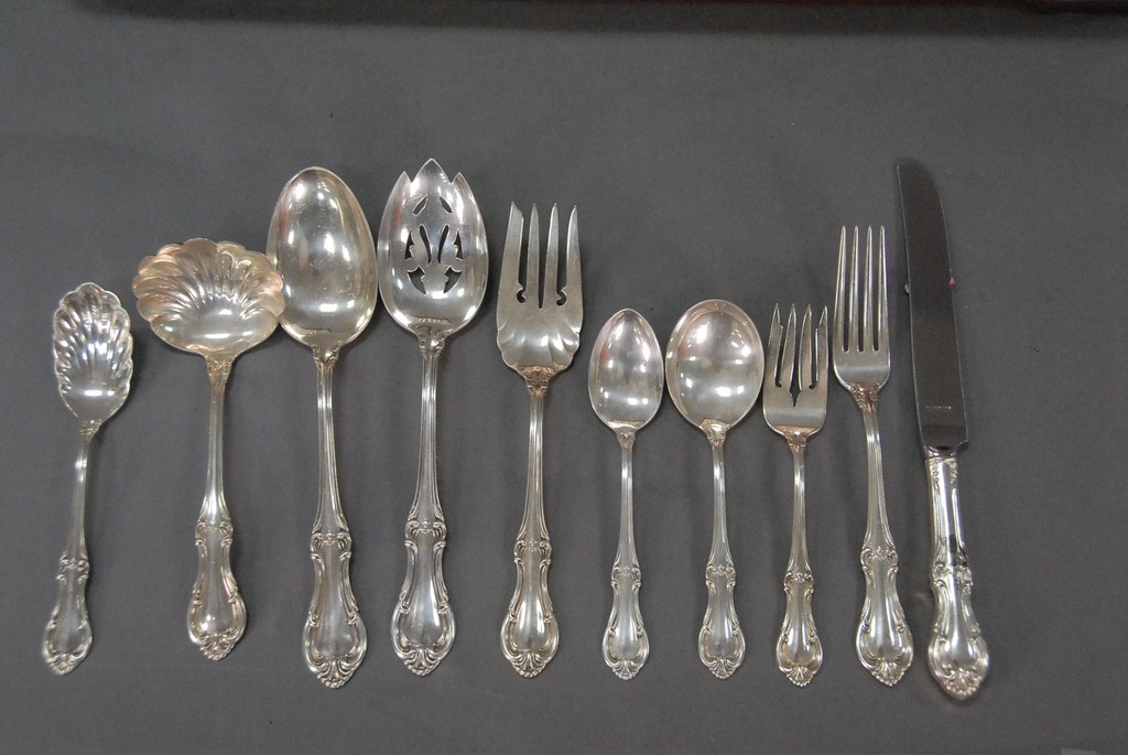 R. Wallace & Sons Monterey pattern, custom hand hammered flatware setting for twelve to include 12 dinner knives, 13 luncheon knives, 12 steak knives, 13 bread knives, 12 cocktail forks, 6 large serving spoons, 12 bouillon spoons, 12 ice tea spoons, 12 teaspoons, 12 ice cream forks, 12 lunch forks, 12 demi spoons, 12 dinner forks, 12 fruit spoons, 10 butter knives, 12 salad forks, 11 fish forks, 11 salt spoons, 12 soup spoons, 24 teaspoons, 3 pasty servers, 2 nut crackers, 1 tomatoe server, 6 cutlery pieces, 2 small sauce ladles, 1 sugar spoon, 2 large fish forks, 2 sugar tongs, 2 large hors d’oeuvres forks, 3 ladles, 1 fish slice, 2 salad sets consisting of two pieces each, 273 pieces total. 244.4 troy oz. plus 62 handles