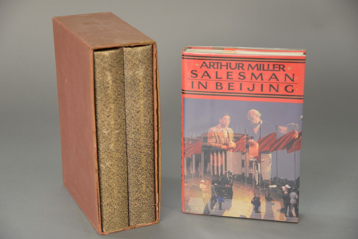 Three piece book lot including Arthur Miller Salesman in Beijing signed by Arthur Miller first edition and Leo Tolstoy Anna Karenina two volumes with slip case, printed for the members of The Limited Editions Club The University Press Cambridge 1951.