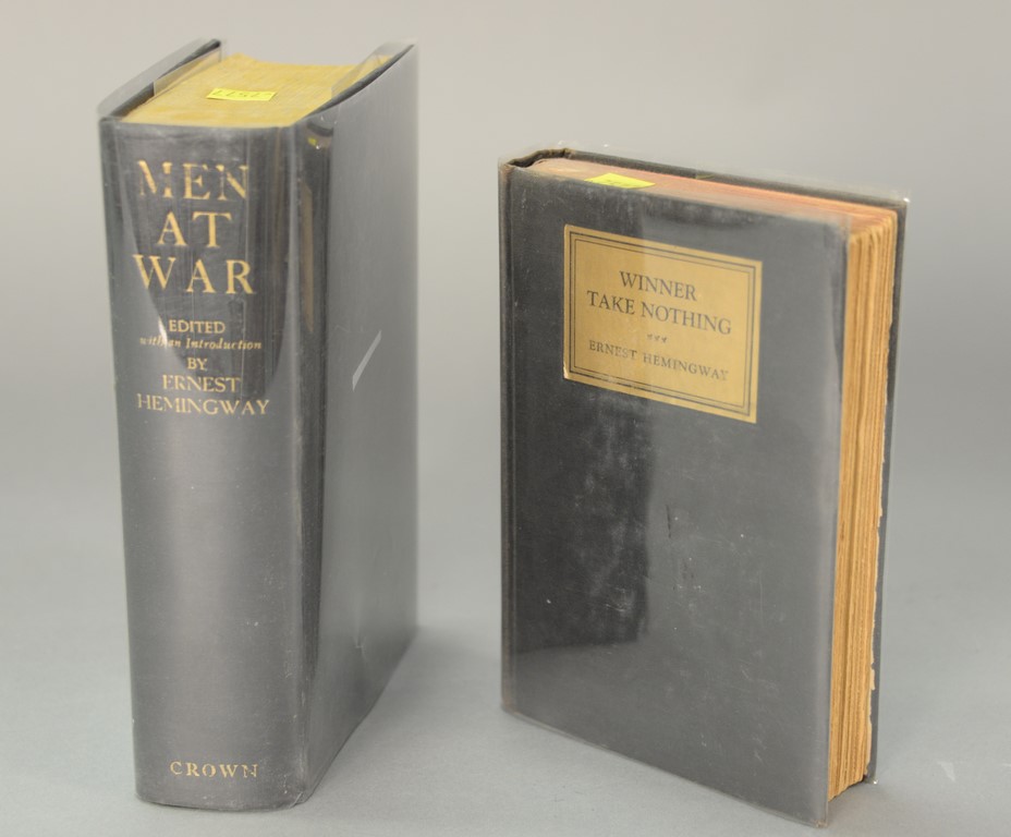 Two piece book lot including Ernest Hemingway Men at War, The Best War Stories of All Time first edition, Crown Publishers New York and Ernest Hemingway Winner Take Nothing first edition, Charles Scribner’s Sons New York, London 1933.