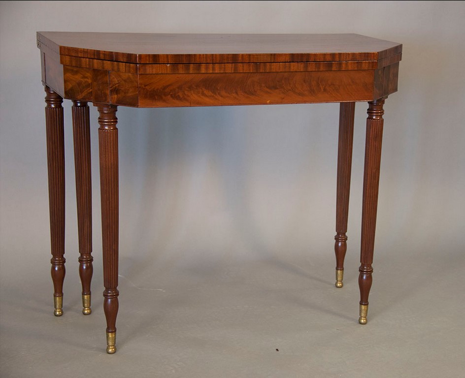Sheraton mahogany game table, top having canted corners, over conforming frieze all set on turned and reeded legs ending in brass capped feet one patch inside top. ht. 30 1/2 in. wd. 35 3/4 in. dp. 17 3/4 in.