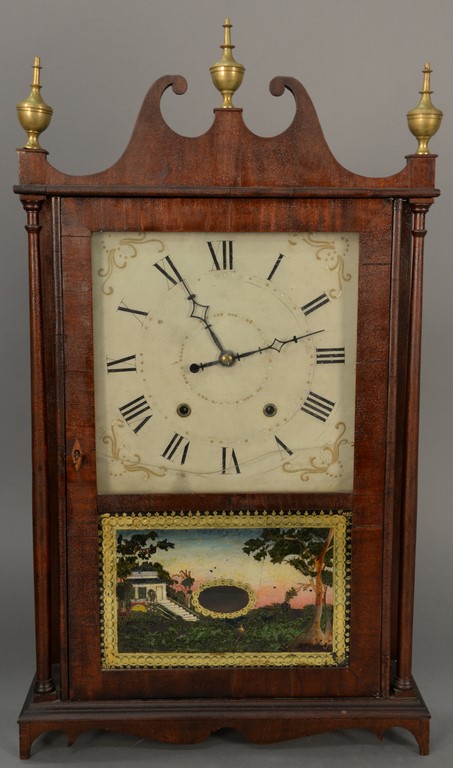 Federal mahogany pillar and scroll shelf clock with wooden weight driven movement, original glass and reverse painted landscape both cracked, with original finials, made and sold at Middletown, Con. By Olcott Cheney, circa 1800 low. ht. 28 in. wd. 16 in. dp. 4 in.