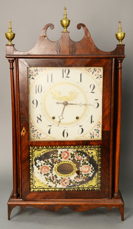 Eli Terry Federal mahogany pillar and scroll mantel clock having original glass bottom reverse painted with flowers, wooden weight driven movement, and paper label on inside Patent Clocks invented by Eli Terry made and sold at Plymouth, Connecticut by Eli and Samuel Terry, circa 1800 glass as is. ht. 29 1/2 in. wd. 16 in.