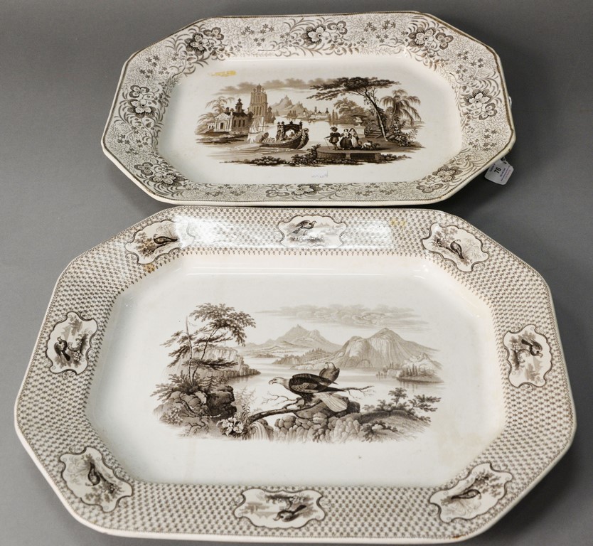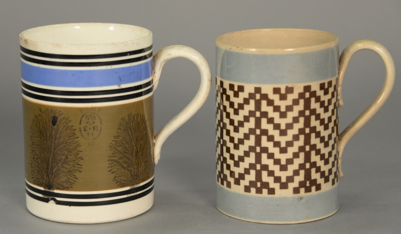 Two Mocha mugs with handles, one with impressed crown and E R 71 on side and painted with brown and blue bands and trees and the other with brown checkering. ht. 6 in. & ht. 5 3/4 in.