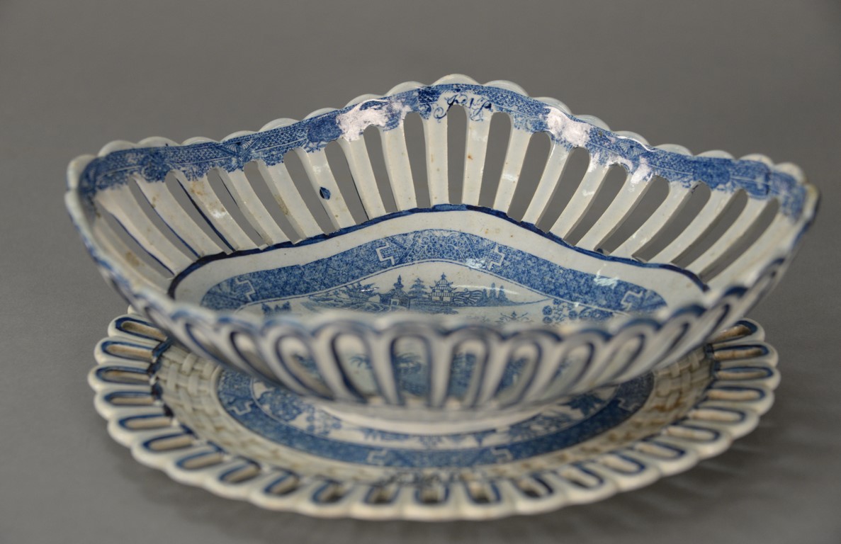 Blue and white reticulated basket and underplate with matching Oriental scene basket broke and repaired. basket: ht. 3 in. lg. 9 1/ 2in. underplate: lg. 9 1/4 in.