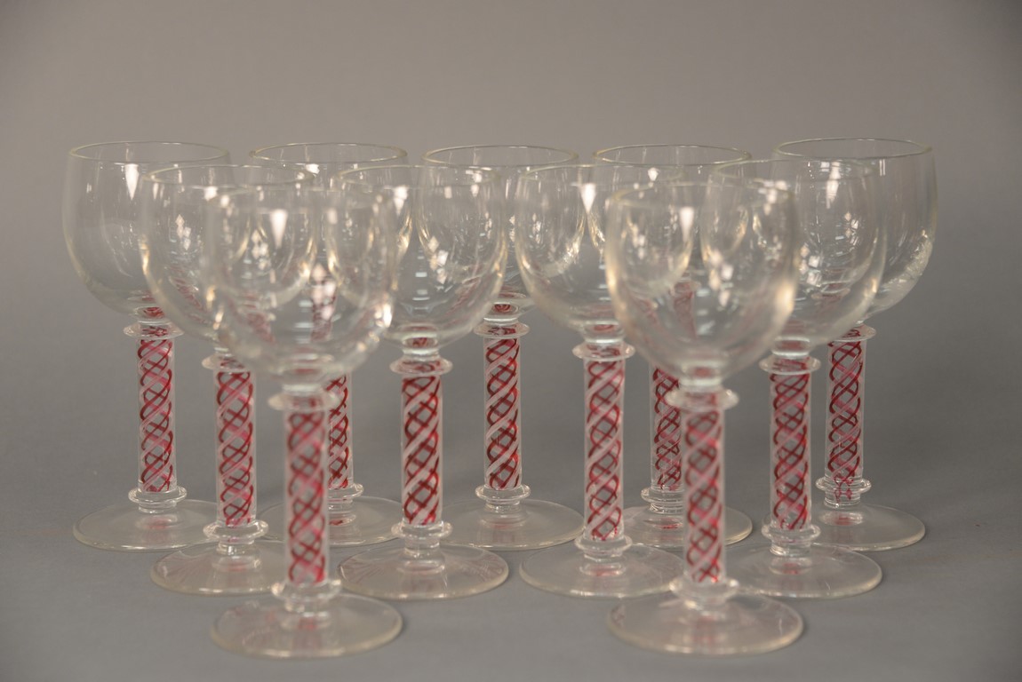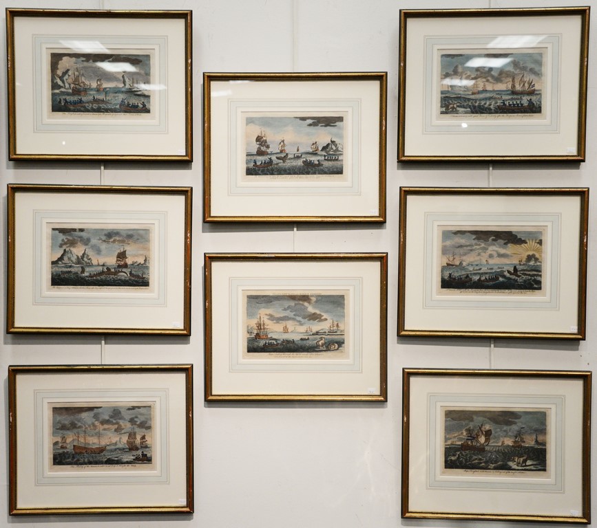 Set of eight framed colored engravings including Views of the Greenland and Whale Fishery printed for Will Allen Map and Print Seller No. 32 Dame Street, Ships Sailing Through the Ice in Search of Whales, The Longboats Making Towards a Whale and the Harpooners Going to Cast Their Lances at Him, and A Whale Struck with the Harpoon Iron Diving Among the Ice, the Harpooner Going to the Rope Off to Prevent the Long Boat Being Drawn Under Water or Split Against the Ice, etc., with Vixseboxse Art Galleries label on back of each. 7 x 11