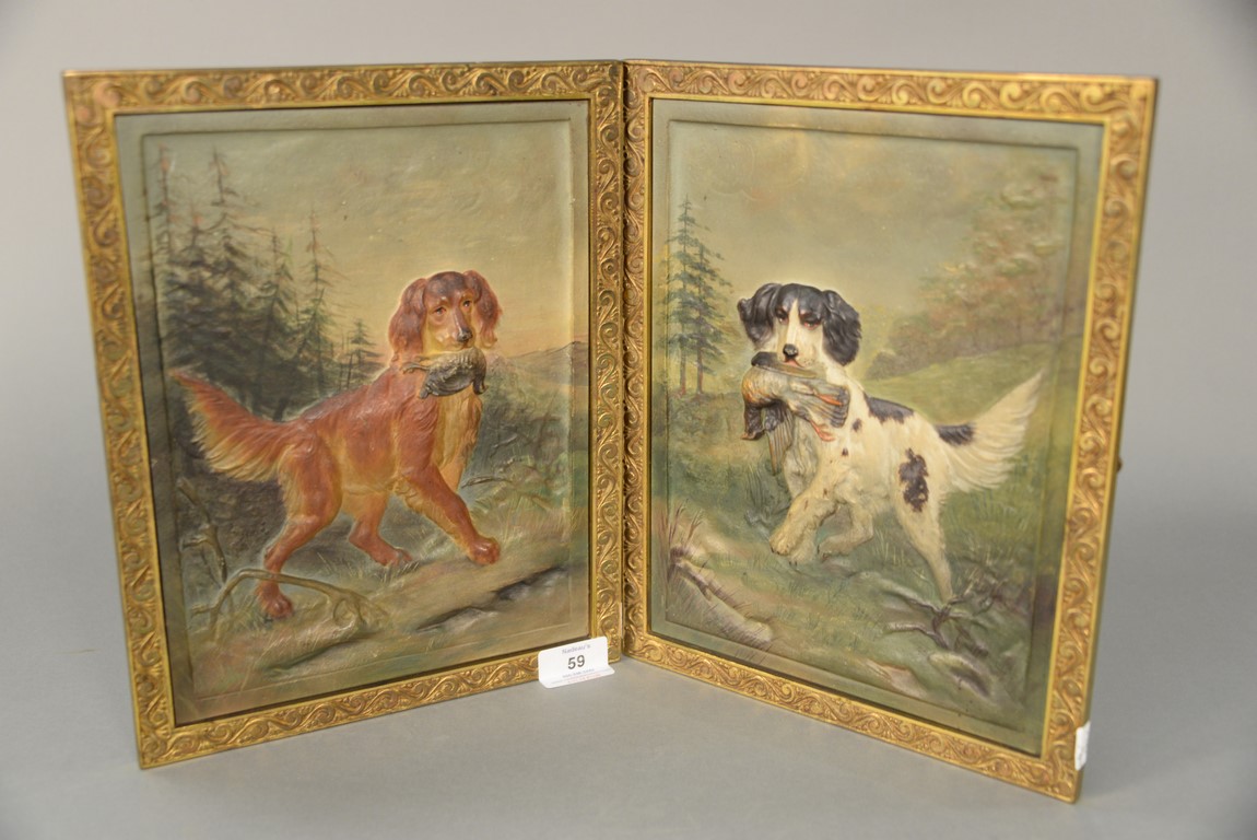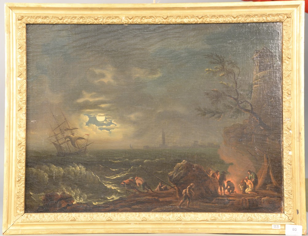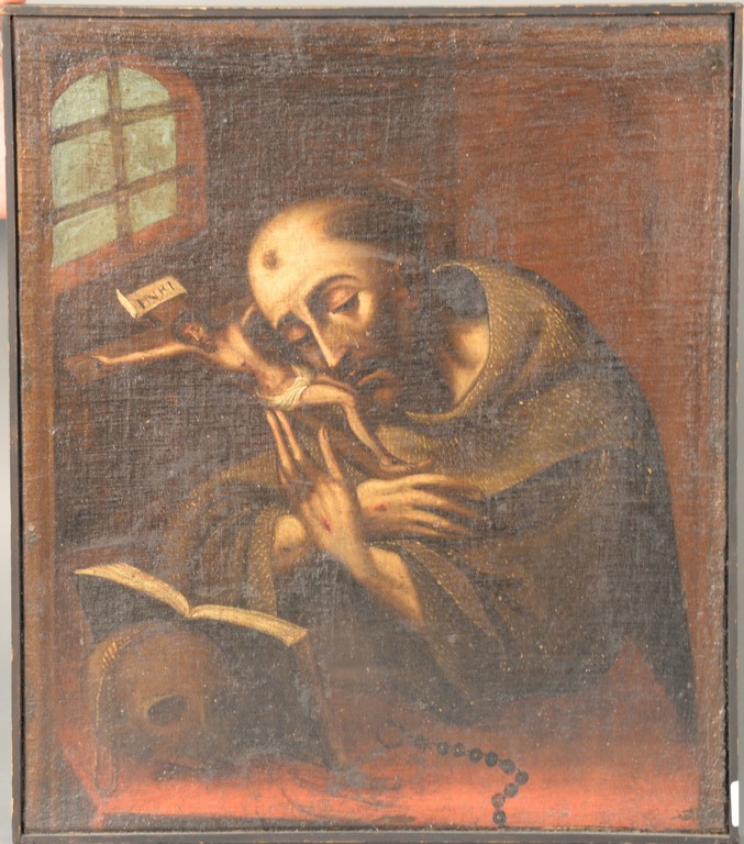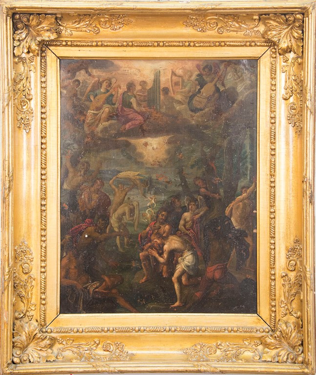 Old Master oil on copper panel Allegorical scene having cherubs and angels playing instruments amongst an offering to John the Baptist holding a staff, with a distant city, having stenciled numbers and letters on reverse, all in period frame, 16th/17th century 18 1/2 x 14 1/2
