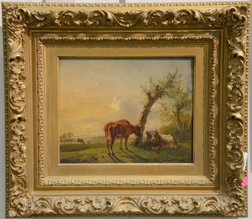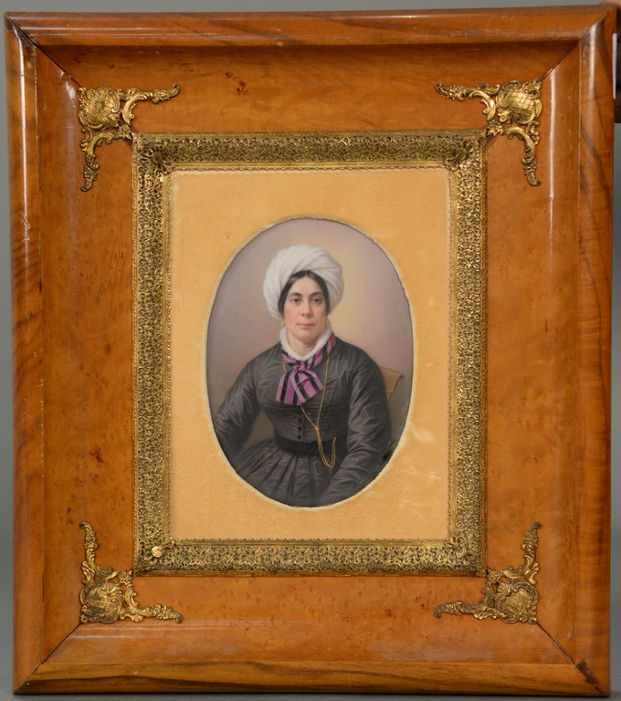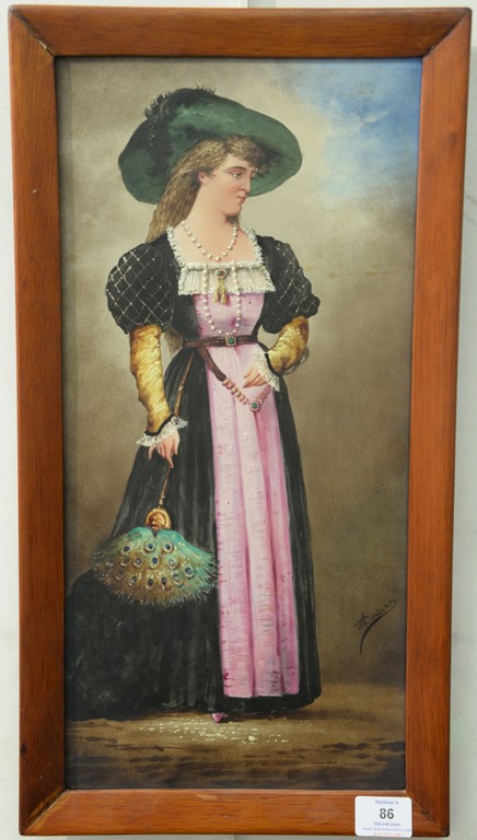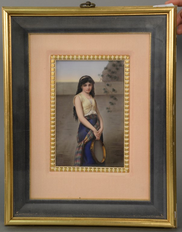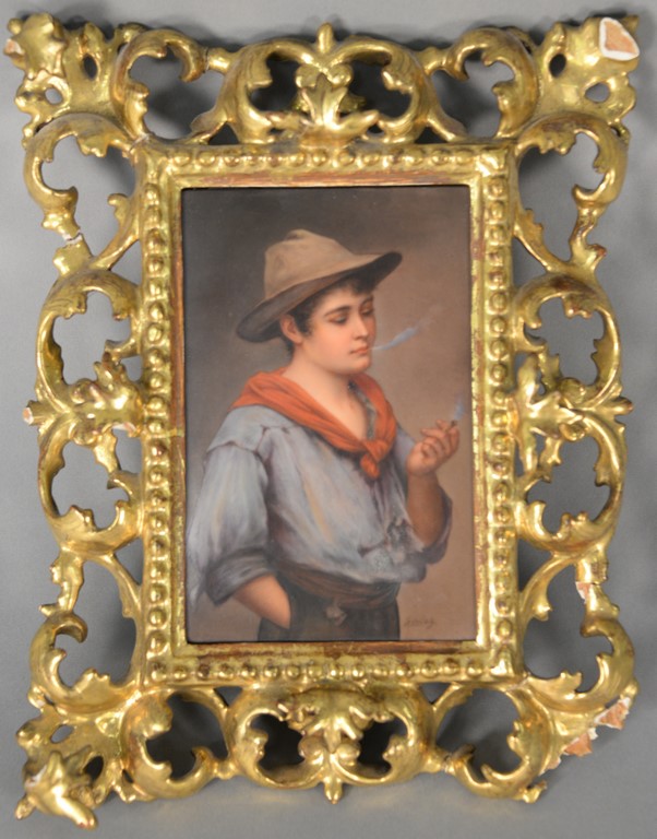 Circle of EUGENE VON BLAAS Piccolo painted porcelain plaque of boy smoking in ornate gilt frame Marked on back Piccolo nach E. V. Blaas frame as is plaque: 6 x 4 1/4