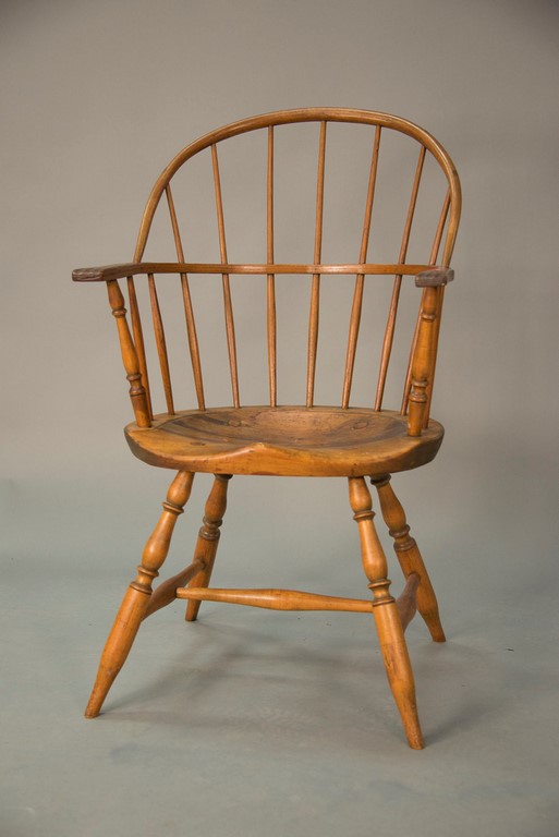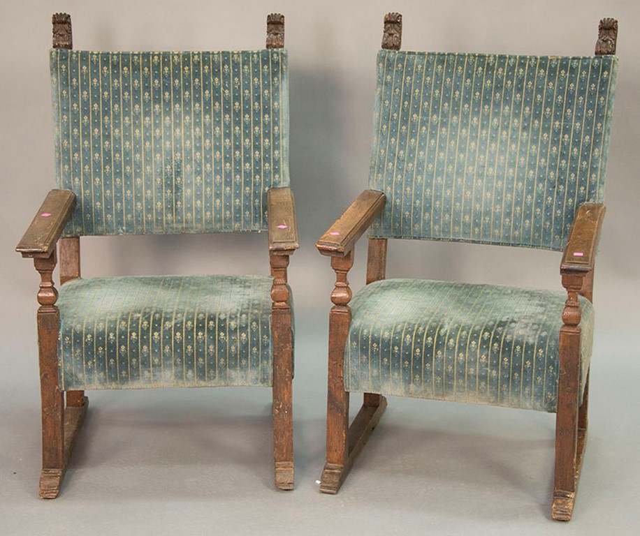 Pair of Italian walnut armchairs having two carved finials over upholstered back and seat, arms supported by carved uprights all set on tressel style feet, Italy probably 17th century. ht. 44 3/4 in. seat ht. 16 1/2 in.