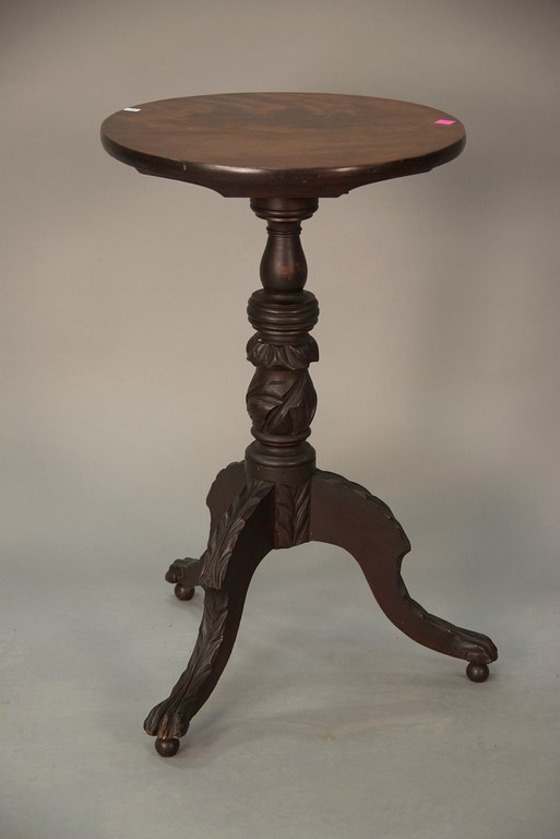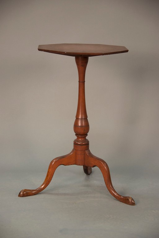 Chippendale cherry candlestand having octagon top over turned shaft on tripod base ending in snake feet, attributed to Chapin School, Connecticut circa 1780. ht. 27 1/2 in. top: 16 x 16 1/2 Provenance: Nathan Liverant & Son The Estate of Sylvia Leven Included Documentation: Copy of Original Bill of Sale 1995