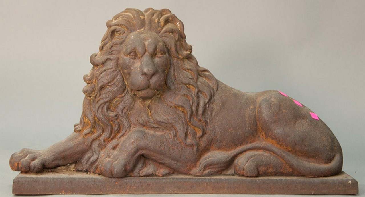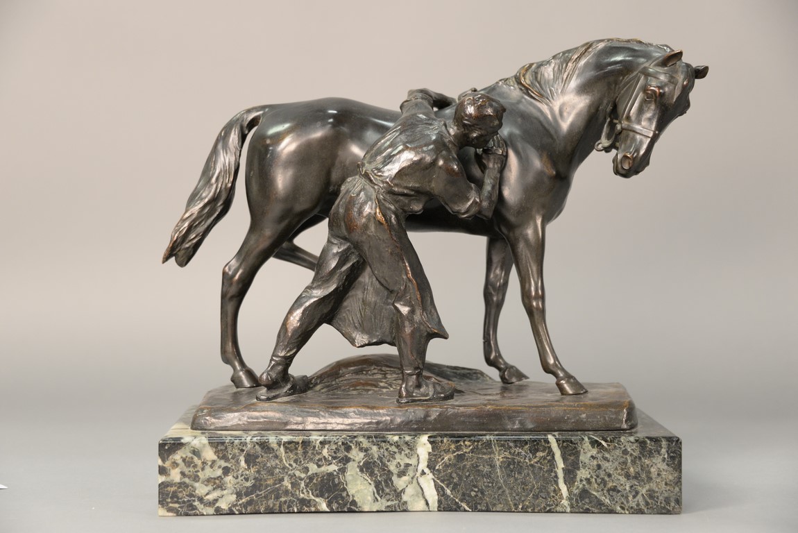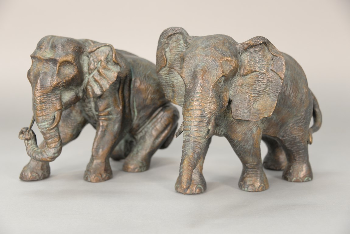 Two large bronze elephants to include Asian elephant in seated position and African elephant mid stride. ht. 9 in. lg. 11 1/2 in. and ht. 9 3/4 in. lg. 15 1/4 in.