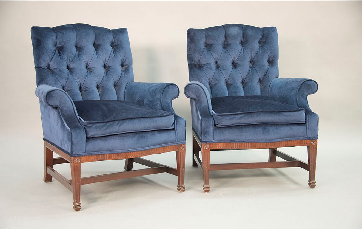 Margolis pair of upholstered easy chairs with tufted back on carved mahogany frame with tapered square fluted legs joined by H stretchers in blue velvet upholstery, excellent condition. seat ht. 15 1/2 in., total ht. 39 in. Provenance: The Estate of Sylvia Leven