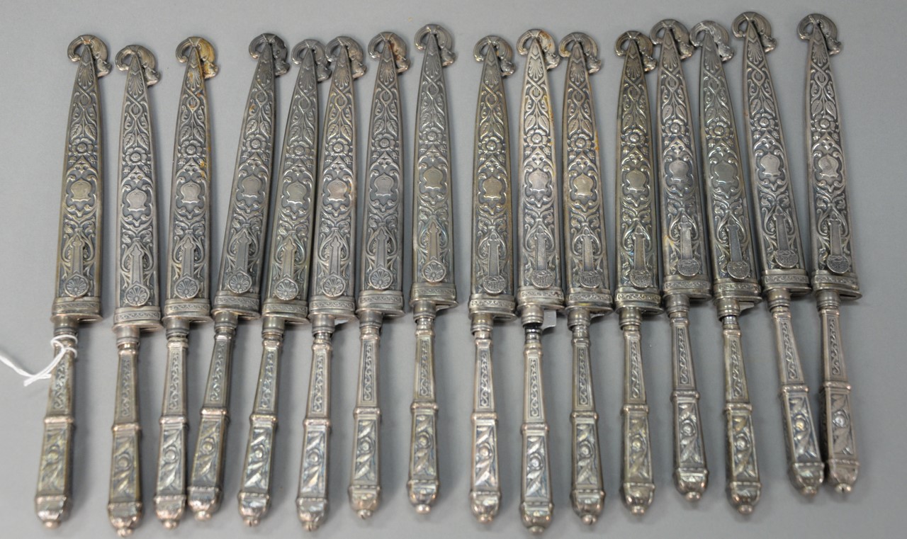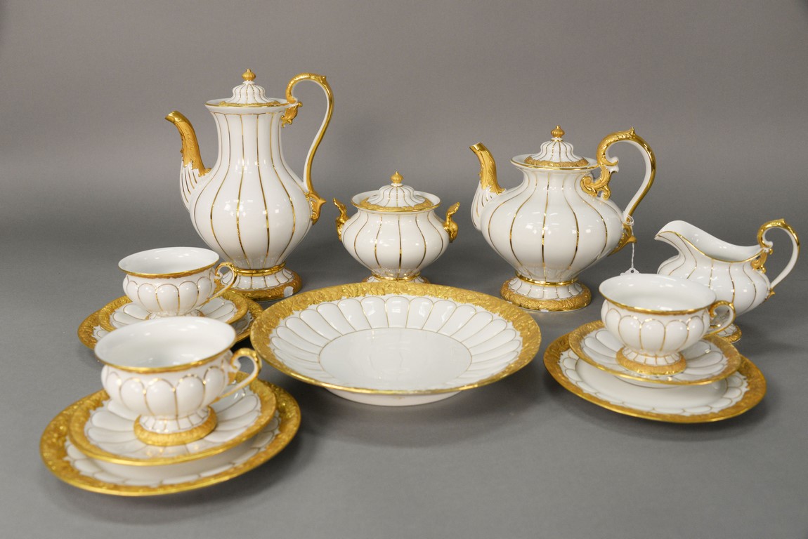 Meissen gold leaf porcelain dessert set having 12 cups, 12 saucers, 12 cake plates, serving dish, sugar, creamer, teapot, and coffee pot, each marked with cross swords and pattern number, 41 total pieces
