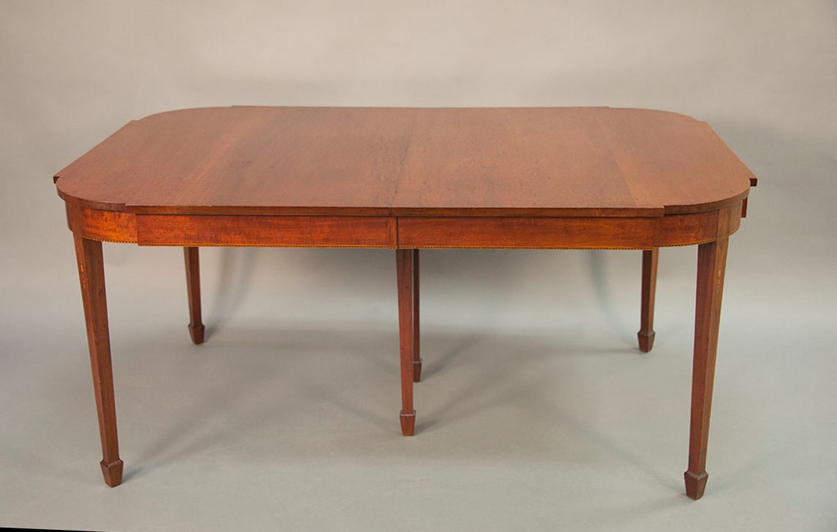 Margolis mahogany dining table, Federal style with plum pudding mahogany D shaped ends over conforming frieze all set on square tapered legs with line, bellflower, and dart inlays having four 12 inch leaves. ht. 30 1/4 in. wd. 45 in. lg. 65 1/2 in. open: 113 1/2 in. Provenance: The Estate of Sylvia Leven