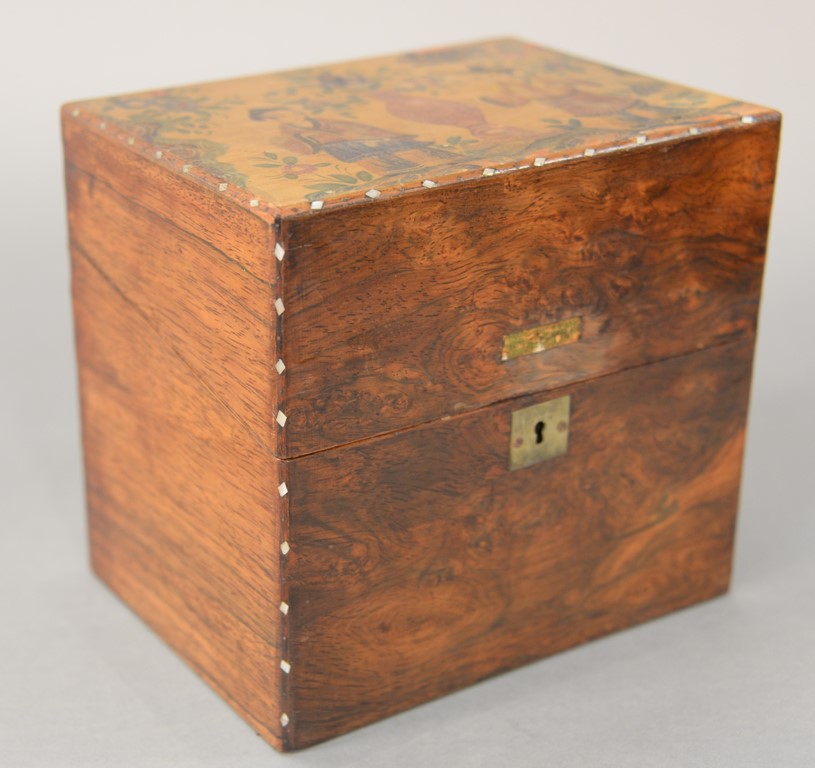 Burl walnut decanter set having hinged top painted with two Oriental figures, scrolling flowers, and large vase, top opening to reveal two crystal decanters. ht. 6 1/2 in. wd. 7 in. dia. 3 1/4 in.
