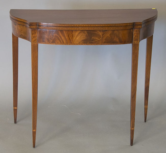 Federal mahogany inlaid game table having D form top over conforming frieze all set on square tapered legs with double tapered ends, circa 1790-1810. ht. 30 1/4 in. wd. 35 3/4 in. dp. 16 1/4 in.